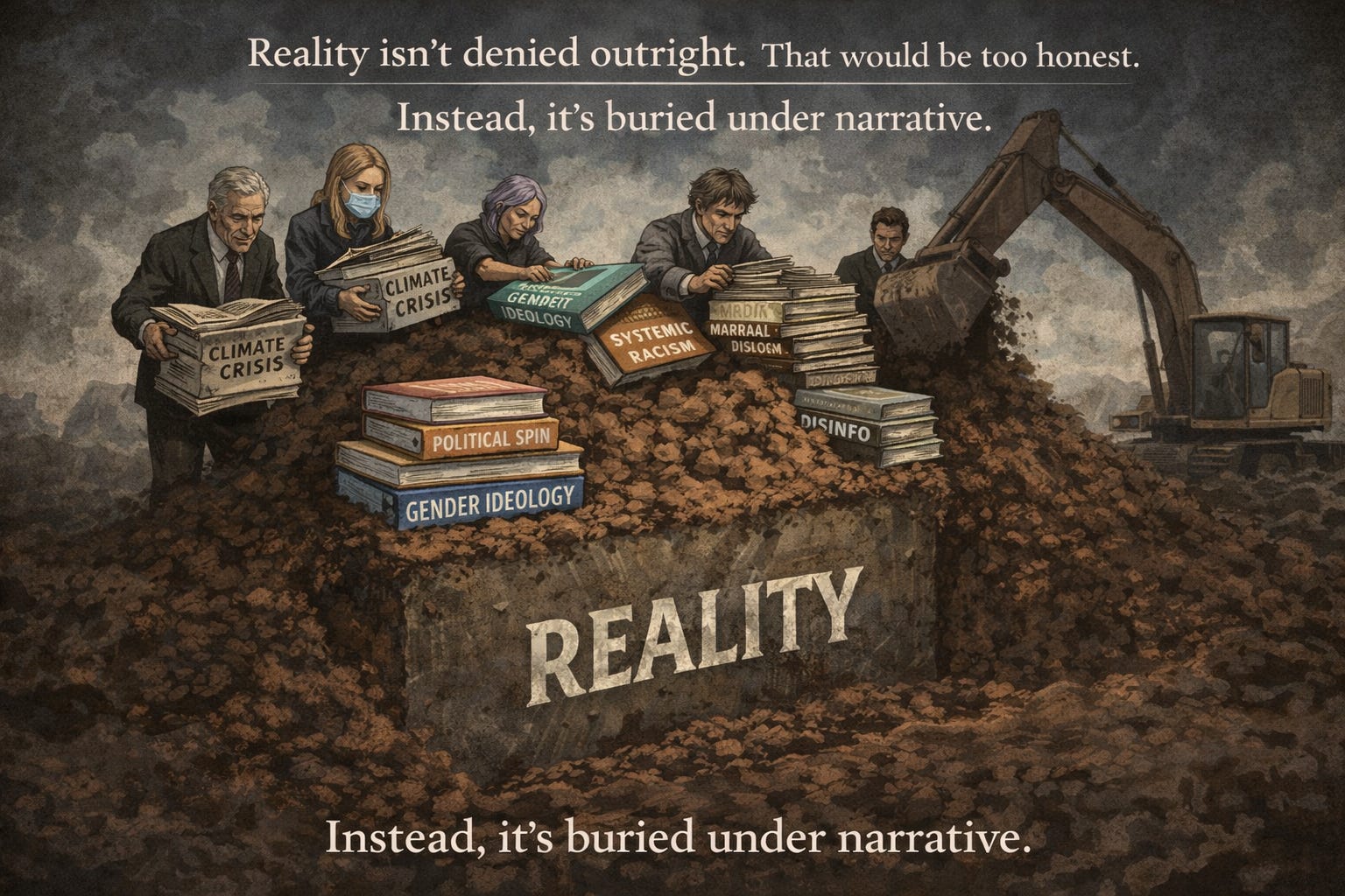 Reality isn’t denied outright. That would be too honest. Instead, it’s buried under narrative.