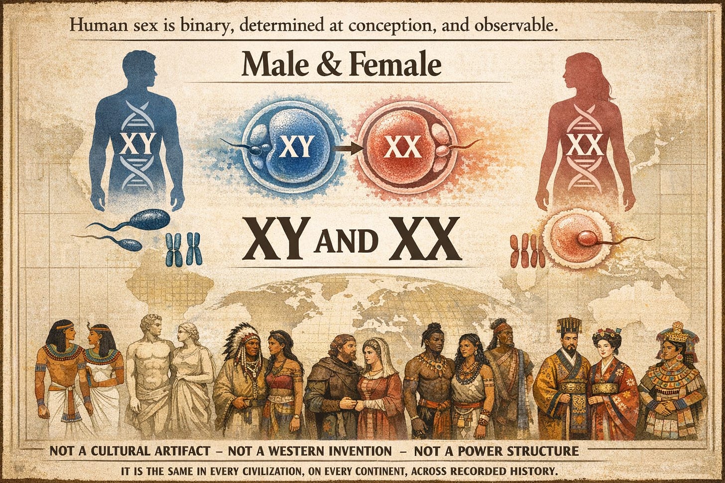 Human sex is binary, determined at conception, and observable. Male and female. XY and XX. This is not a cultural artifact, a Western invention, or a power structure. It is the same in every civilization, on every continent, across recorded history.