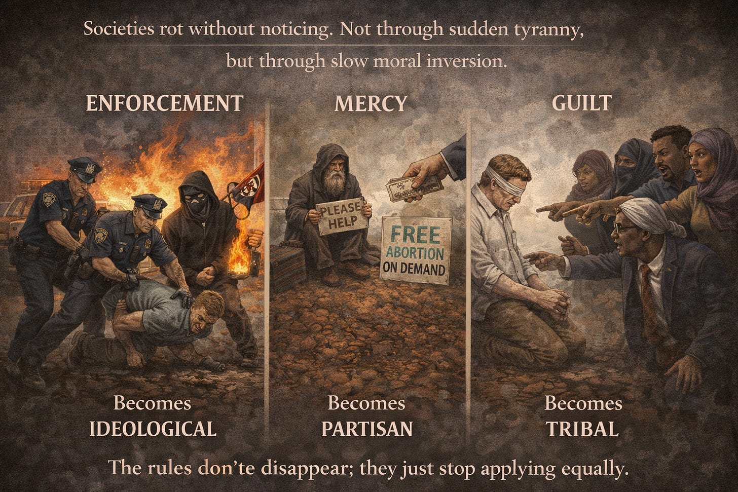 This is how societies rot without noticing. Not through sudden tyranny, but through slow moral inversion. The rules don’t disappear; they just stop applying equally. Enforcement becomes ideological. Mercy becomes partisan. Guilt becomes tribal.